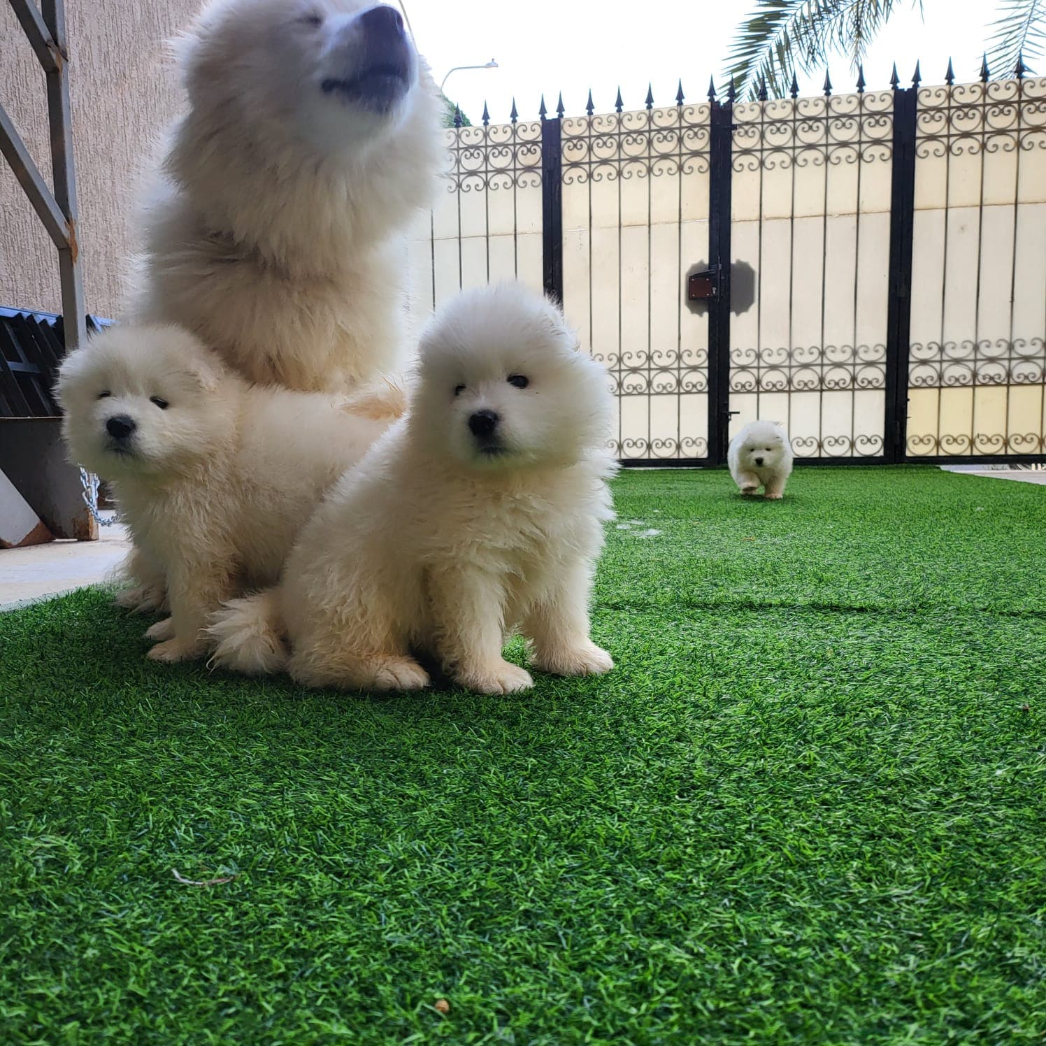 جراوي سامويد للبيع سلالة أصلية اهالي وارد الخارج شعر طويل حجم ضخم عمر 80 يوم