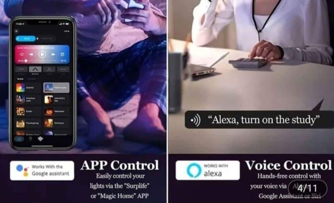 4 مصابيح مع جهاز تحكم عن بعد، توفر الكهرباء والجهد، ويمكن التحكم فيها عن طريق التحكم عن بعد والهاتف المحمول والأوامر الصوتية Alexa ومساعدة G
